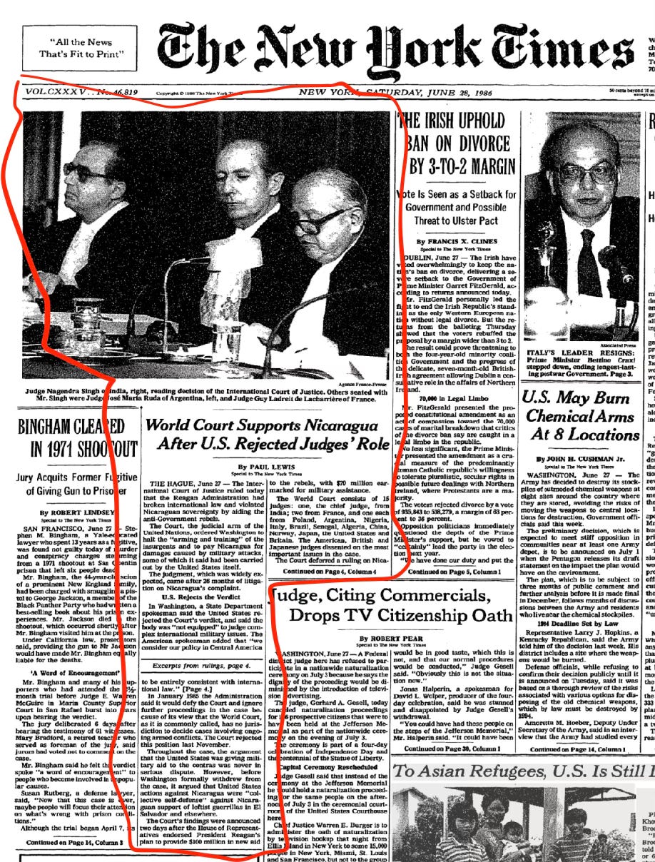 the matter evoked a strong reaction abroad. Media sources from around the globe took an interest in the issue and newspapers in France, Ireland, Great Britain, Lebanon, the Soviet Union, India, amongst others, ran cover stories detailing Reagan’s rejection of the ICJ’s jurisdiction.